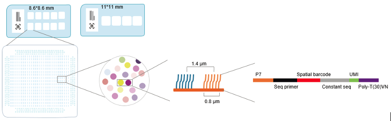 芯片包括兩種類型:組織透化芯片和基因表達芯片,表達芯片捕獲區(qū)域面積為11*11mm。在捕獲區(qū)域內存在著數(shù)千萬的探針簇,每個探針簇的直徑為0.8 μm,每平方微米有約18000 條探針,用于捕獲轉錄本(圖1)。每條探針捕獲序列由5 部分組成 :
